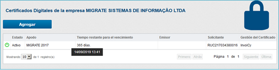 En la columna “Tiempo restante para el vencimiento” se exhibirá la cantidad de días que faltan para el vencimiento del certificado digital.