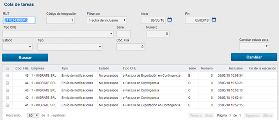 La opción Cola de tareas tiene como principal funcionalidad mostrar cuales fueran las tareas ejecutadas automáticamente por InvoiCy para la empresa o sucursal, permitiendo verificar si fue procesada con éxito o si hay error en su procesamiento.