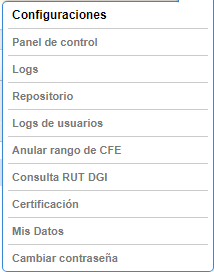El enlace “Panel de control” redirige al panel de control del sistema; el ícono “Logs” dirige a la pantalla de registros del sistema; el enlace “Repositorio” abre la pantalla del repositorio del sistema; el enlace “Logs de usuarios” permite acceder a la pantalla de registros de usuarios; el enlace “Anular rango de CFE” abre la pantalla de anulación de rangos de CFE; y el enlace “Certificación” dirige a la pantalla de apoyo para las empresas que se encuentran en la fase de certificación.