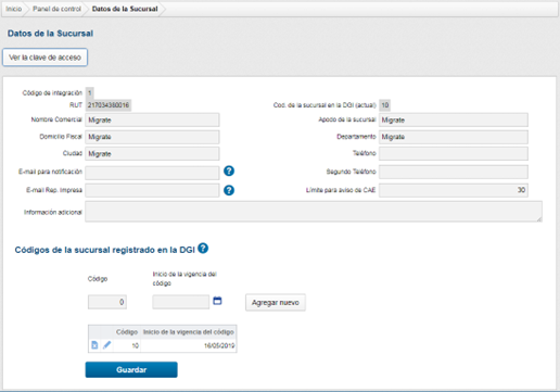 El campo “Código de Integración” muestra el código de la casa principal/sucursal, utilizado en las comunicaciones vía Servicios Web y en las tablas del Conector de Base de Datos. Los campos RUT, Nombre Comercial, Razón Social, Nombre de la Casa Principal/Sucursal de la DGI, Domicilio Fiscal, Departamento, Ciudad, Teléfono y Segundo Teléfono deben ser llenados con los datos de la empresa y el campo “E-mail responsable” posibilita registrar el e-mail del responsable por la empresa, que recibirá e-mails en caso de notificaciones. También está disponible el campo de Limite para aviso de CAE para configuración del numero limite para que InvoiCy genere la notificación de falta de numeros de CAE. Está disponible también la opción si desea que sea enviada alguna información adicional del receptor en los comprobantes. El campo “Código” posibilita registrar el código de la sucursal e en el campo “Inicio de la vigencia del código” es necesario informar la data de inicio de uso del código.