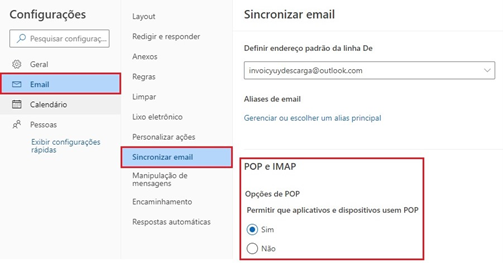 Al poner un clic en esa opción, se abre una pantalla de Microsoft donde el usuario puede informar su correo y también su contraseña. Basado en eso, InvoiCy comunica con Microsoft que autoriza la casilla informada a utilizar InvoiCy para enviar correos electrónicos. Después de registrar el correo electrónico para la descarga, es necesario habilitar la opción POP en la configuración de Outlook.