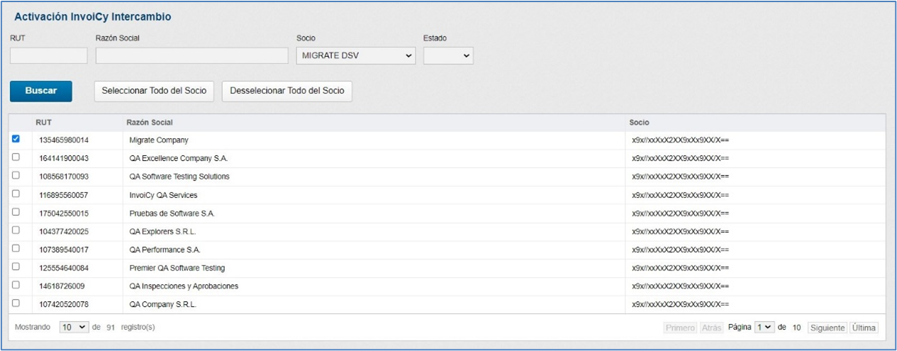 En caso de que existan empresas con diferentes claves de socios registradas en la instalación InHouse, solo estarán disponibles para activación las empresas con la clave del socio que haya contratado la extensión "InvoiCy Intercambio".