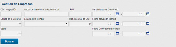 Esta pantalla contiene los filtros por Código de integración, nombre de la sucursal, RUT, código de la sucursal de la DGI, clave del partner, vencimiento del certificado digital, fecha de activación de la licencia, fecha de último cambio de la licencia, estado de la sucursal o estado de la licencia.
