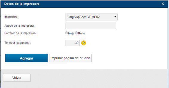 En formato de la impresión, deberá seleccionar que tipo de impresión que la impresora hace, selecionando una de las opciones, rollo o Hoja (A4). En Timeout se configura el tiempo maximo que InvoiCy deberá aguardar para intentar hacer la impresión.