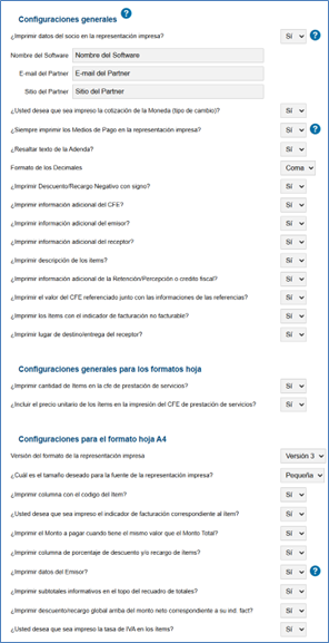 En configuraciones generales tendrá disponible las opciones si desea que en la representación impresa se imprima los datos del sócio, como el nombre del socio, sitio del socio y e-mail del socio. Los datos informardos estarán impresos en la zona inferior derecha del formato de hoja y formato rolo.