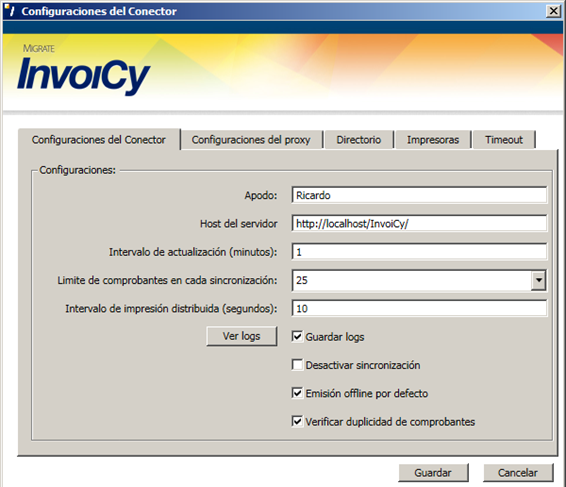 Cuando se desea que el InvoiCy gestione las impresiones y las impresoras no están conectadas al servidor, se puede utilizar instalar el Conector InvoiCy UY. Despues de instalado el ejecutable en la maquina que tiene conexión con la impresora en “Configuraciones del Conector”, en “Intervalo de Impresión Distribuída (segundos)” configure el tiempo entre cada ejecución del ejecutable que busca las impresiones pendientes y envia la misma para la impresora.