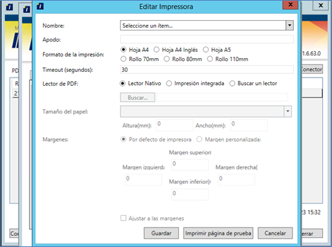 Impresión integrada: seleccionando esa opción se utilizará una tecnología interna del InvoiCy Conector para impresión. Desde esa opción es necesario informar cual es el tamaño del papel que la impresora configurada estará imprimiendo. También desde esa opción estará disponible la posibilidad de personalizar el tamaño de las márgenes de la hoja.