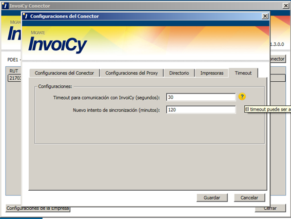 En la pantalla “Timeout” hay disponible dos campos: “Timeout para comunicación con InvoiCy (segundos)” es el tiempo máximo de espera en la comunicación con InvoiCy. En los casos en que no si puede comunicar con InvoiCy en ese tiempo, se utilizará el tiempo configurado desde el campo “Nuevo intento de sincronización (minutos)” para hacer un nuevo intento de comunicación. Por estándar el conector está configurado para intentar comunicar con InvoiCy en lo máximo 30 segundos, si no fue posible hacer la comunicación, solo intentará sincronizar nuevamente después de 120 minutos.