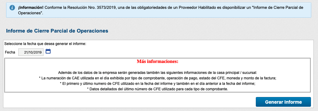 Conforme Resolución Nº 3573/2019 de la DGI, todo Proveedor Habilitado debe posibilitar la generación de un Informe de Cierre Parcial de Operaciones donde es posible verificar una serie de informaciones para fines de auditoría de la empresa.