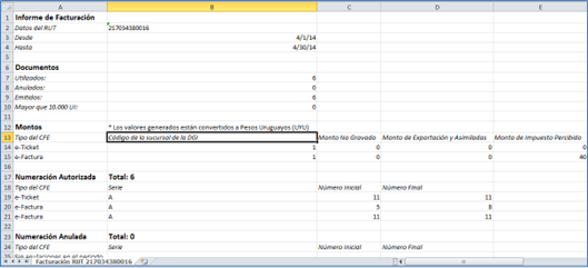 En el Informe de Facturación se posibilita exportar para un archivo Excel (.xlsx) los datos enviados en el reporte diario en un período de tiempo determinado. A través de este informe es posible exportar el total de documentos enviados a la DGI, autorizados y anulados, numeración y serie de los comprobantes enviados y los valores enviados agrupados por tipo de comprobante o sucursal.