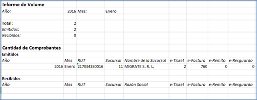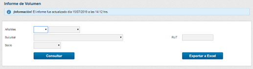 Desde la opción de Informe de Volumen es possible generar el listado de la cantidad de comprobantes emitidos y recibidos de las empresas y sus sucursales mensualmente. En la pantalla se puede hacer filtros por el año, mes, nombre de la sucursal, como también por el RUT, como muestra la imagen en continuación.