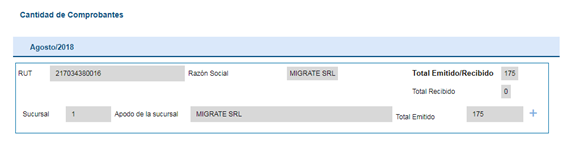 Se generará el listado correspondiente al filtro hecho, poniendo en sus detalles el RUT de la empresa, su razón social, Codigo de la Sucursal o casa principal, el Nombre de la Sucursal y al lado el total de comprobantes Emitidos y el total de comprobantes recibidos. Haciendo el clic en el botón mas, es posible visualizar la cantidad de comprobantes emitidos por el tipo.