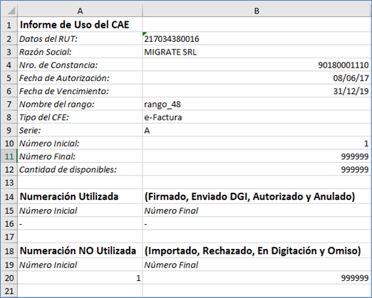 Desde la opción Informe de uso del CAE será posible generar el listado de los numeros utilizados de un CAE específico y los no usados. Posibilitando aún hacer un filtro del rango del CAE cuando tiene configurado más de un rango para el mismo CAE.