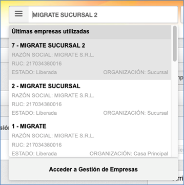 La primera empresa que aparece en la lista es la empresa que está actualmente seleccionada, al colocar el cursor del mouse y hacer un clic, esta empresa será seleccionada. Además, se muestra en la combo también las últimas diez casa principales/sucursales utilizadas por el usuário. Caso sea necesario buscar por una empresa se puede hacer un filtro por Razón Social, Apodo de la Sucursal, Código de Integración o RUC.