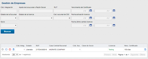 Haciendo clic en la opción “Acceder a Gestión de Empresas”, InvoiCy abre la pantalla de Gestión de Empresa para que sea posible hacer filtros avanzados o buscar por empresas ya inactivadas.