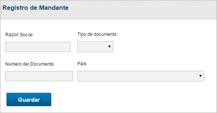 Para registrar un nuevo mandante hay que informar los campos de Razón Social, el tipo de documento, Número del documento y el país del mandante.