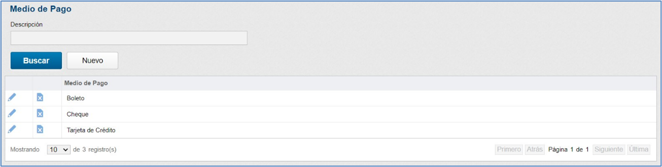 Haciendo el clic en ese botón se abre la pantalla que se puede la pantalla que se puede utilizar para mantener los medios de pago registrados en la plataforma. Puede buscar un medio de pago ya registrado en el InvoiCy y luego editarlo o registrar un nuevo a través del botón correspondiente.