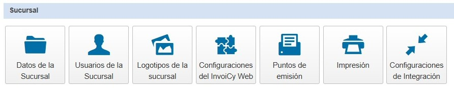 El menú Sucursal permite gestionar toda la configuración y los datos específicos de cada sucursal registrada en InvoiCy. Este menú contiene los íconos de acceso a las distintas pantallas, como se muestra en la figura a continuación.