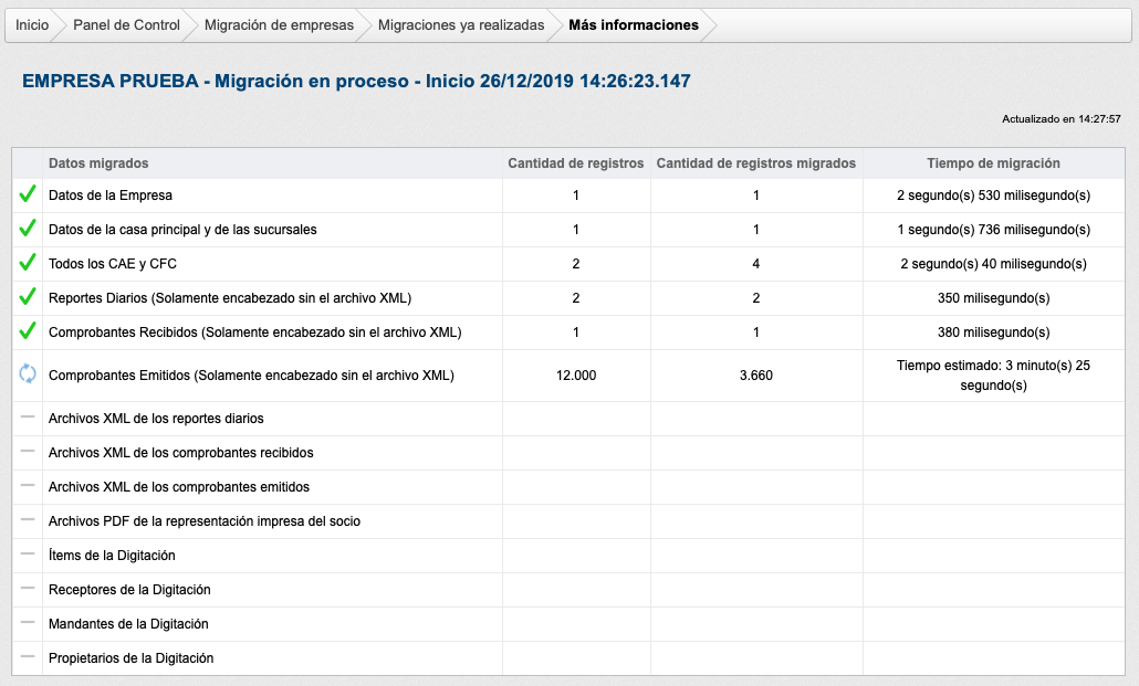 Desde la Nube Migrate es posible mirar el progreso de la migración. Desde esa pantalla es posible mirar los datos que fueron seleccionados para migrar así como la cantidad de registros programados para migrar, la cantidad de registros ya migrados, el tiempo de migración y el estado de la migración.