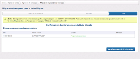 Después de finalizar el wizard de migración, eligiendo las empresas y los datos que es necesario migrar, la aplicación automáticamente bloquea la emisión de todas las sucursales de esta empresa para que no sea más posible utilizar la instalaciones InHouse para emisión de factura. En otras palabras, una vez programada la migración no es más posible utilizar la instalación InHouse.