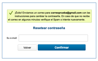 Al hacer ese proceso el usuario recibirá en su casilla de e-mail un correo electrónico con un link para resetear la contraseña. Ese link tendrá validez de una hora y podrá ser utilizado solamente una vez. Para situaciones en que el link caducó o ya fue utilizado es necesario realizar todo el proceso nuevamente.