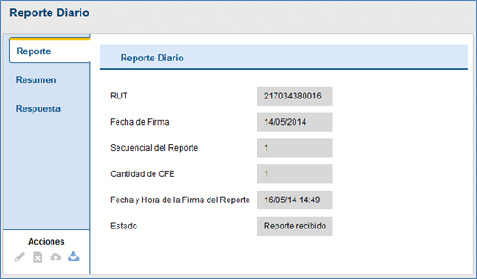 Para ver los detalles del reporte diario, como datos de la empresa, cantidad de CFE, fecha, hora, respuesta de la DGI y resumen de valores, se debe hacer clic en cualquiera de los dos campos de registro deseado. Al hacer clic en uno de los campos, se abrirá una pantalla donde estarán disponibles tres pestañas con los datos del reporte. En la pestaña “Reporte” se pueden ver los datos principales del reporte, como RUT del emisor, cantidad y fecha de firma de los CFE contenidos en el reporte, fecha de firma del reporte y estado del mismo. En la pestaña “Resumen” estarán los datos detallados del CFE, totales y rangos utilizados y anulados. En la pestaña “Respuesta” se podrán ver los logs del proceso del reporte en cuestión e inclusive la respuesta de la DGI, de aceptación o los motivos del rechazo.