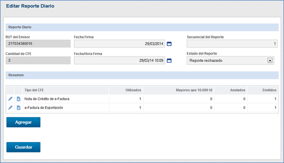 Editar reporte diario. Opción disponible solamente cuando el estado del reporte diario sea Generado o Rechazado.