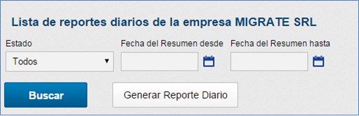 La imagen anterior muestra la pantalla de generación y búsqueda de reporte diario. En la parte superior de la pantalla contiene filtros para buscar determinado reporte.