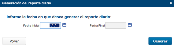 En esta pantalla basta especificar la fecha del reporte diario deseado y hacer clic en el botón “Generar” para que el reporte sea generado. Haciendo clic en el botón “Volver” la pantalla será cerrada y podrá ser observado en la parte superior de la tabla, el nuevo reporte diario.