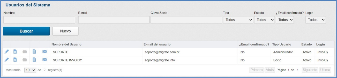 El menú gestión también posee una pantalla de usuarios, por lo tanto, en esa pantalla no solo se muestran los usuarios de la empresa, sino también todos los usuarios registrados en InvoiCy.