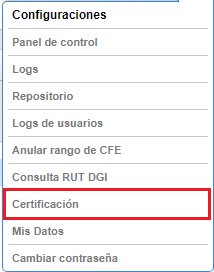 Luego de emitir un comprobante, la pantalla de Certificación puede ser accedida mediante el enlace “Certificación”, disponible en el menú de Configuraciones ubicado en el encabezado del sistema, como se muestra en la imagen a continuación.