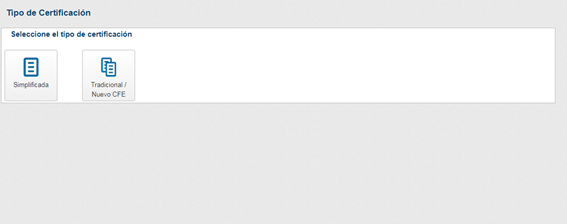 Al hacer clic en la opción “Certificación” del menú de Configuraciones, el usuario es redirigido a la pantalla de “Tipo de Certificación”, donde puede seleccionar la modalidad de certificación deseada: “Simplificada” o “Tradicional / Nuevo CFE”.