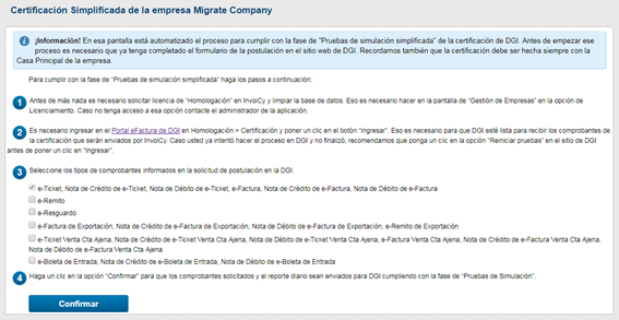 En esa pantalla están numerados los pasos necesarios para cumplir com la Certificación Simplificada. En el Paso 3 deberá seleccionar los tipos de comprobantes que ha postulado en la pantalla de DGI. Al hacer clic en “Confirmar”, InvoiCy generará los comprobantes y el reporte diario automáticamente.