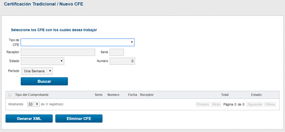 En la figura más atrás se pueden ver varias opciones de filtro (activadas automáticamente a través del botón “Buscar”), una tabla mostrando los CFE de la base de datos donde es posible seleccionar los comprobantes con los cuales se desea trabajar y botones para generar un XML del lote para enviarlo a la DGI (botón “Generar XML”) y para eliminar los comprobantes seleccionados del banco de datos (botón “Eliminar CFE”).