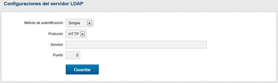 En el campo ”Método de autentificación” debe ser seleccionado el método de autentificación usado por el servidor. A continuación, el protocolo, seleccionando si el mismo es HTTP o HTTPS. En el campo “Servidor” se debe colocar la dirección del servidor. En el campo “Puerto”, el puerto del mismo. Llenados todos los campos, haga clic en “Guardar”.