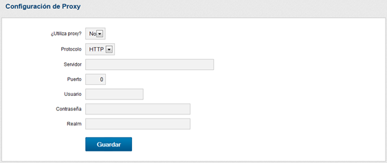 En el campo “Utiliza Proxy?” debe ser seleccionada la opción sí o no para identificar si el proxy será utilizado o no. En el campo Protocolo se debe seleccionar el protocolo de acceso del Proxy. En el campo Servidor debe ser insertada la dirección del servidor. En el campo Puerto debe ser insertado el puerto del servidor.
