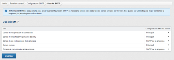 Además, en la pantalla de Configuración SMTP aún es posible elegir el botón “Uso del SMTP” y seleccionar cual configuración SMTP registrada el usuario desea que InvoiCy utilice para cada tipo de correo que será enviado.