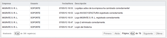 La tabla de logs del usuario está dividida por las columnas de Empresa, que muesta la empresa en acción; Usuario, que muestra el usuario que ejecutó la acción; fecha/hora, que muestra la fecha y hora en que ocurrió la acción y la columna Descripción, que muestra la descripción de la acción del usuario.