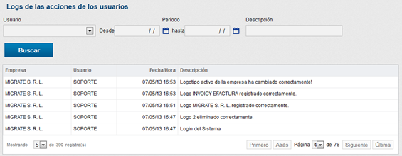 La pantalla de logs de usuarios guarda todas las acciones realizadas por los usuarios del sistema, así como también sus respectivos períodos.