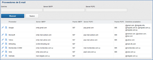 La opción de Proveedores de E-mail permite registrar, cambiar y borrar proveedores SMTP y POP3. Ese listado de proveedores es utilizado por la aplicación, cuando una configuración SMTP o POP3 está siendo configurada por un usuario cualquier, para sugerir al usuario las configuraciones ya predefinadas en la aplicación.