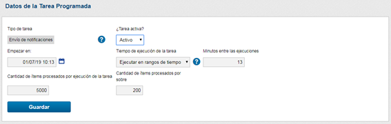 Al agregar una tarea, es posible seleccionar el tipo de tarea, la fecha a partir de la cual la misma comenzará a ser ejecutada, el intervalo de tiempo entre las ejecuciones, si la tarea está activa o no, y también para algunas tareas específicas si muestran los campos “Cantidad de ítems procesados por ejecución de la tarea”, “Cantidad de ítems procesados por sobre” y “Cantidad máxima de intentos”. Eses campos ya tienen valores por defecto todavía, si puede cambiar eses valores conforme la necesidad.