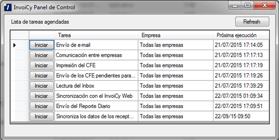 En la pantalla de configuración de las tareas programadas, está la lista de las tareas que InvoiCy ejecuta automáticamente en tiempos pre-determinados. Las tareas, las empresas involucradas y el tiempo de las ejecuciones pueden ser configurados en esta pantalla.