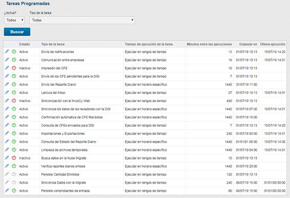 Hay varios tipos de tareas, que son: “Envío del notificaciones”, que envía los e-mails pendientes de las notificaciones del sistema; “Comunicación entre empresas”, que envía los CFE para la empresa receptora (tanto por correo electrónico como mediante servicio web); “Impresión del CFE”, que imprime los CFE enviados en caso de que la empresa tenga configurada la impresión automática de CFE de forma agendada; “Envío de los CFE pendientes para la DGI”, que envía los CFE pendientes a la DGI; y “Envío del Reporte Diario”, que genera y envía el reporte diario a la DGI automáticamente; “Lectura del Imbox”, que hace la lectura y importación de los comprobantes recibidos; “Sincronización con el InvoiCy Web”, hace la sincronización con la base del InvoiCy Web cuando es utilizado una base exclusiva o el servicio de hospedaje de Migrate para el InvoiCy Web; “Sincroniza los datos de los receptores con la DGI”, hace la sincronización de los datos de los receptores electrónicos y carga eses datos en InvoiCy; “Confirmación automatica de CFE Recibidos”, si puede configurar para que a cada X días, InvoiCy confirme todos los CFE recibidos que no fueran respondidos manualmente por el usuario; “Consulta de CFE enviados para DGI”, hace la consulta de los CFE enviados a DGI que aún no fueran autorizados; “Limpieza de Archivos Temporales” es una tarea que estará eliminando archivos no necesarios en las carpetas temporales del InvoiCy; “Comunicación con la Migrate”, es una tarefa de hace comunicación con la Nube Migrate para actualizar automáticamente el valor de la Cotización de UI y también actualiza el parámetro si DGI está ONLINE o OFFLINE.