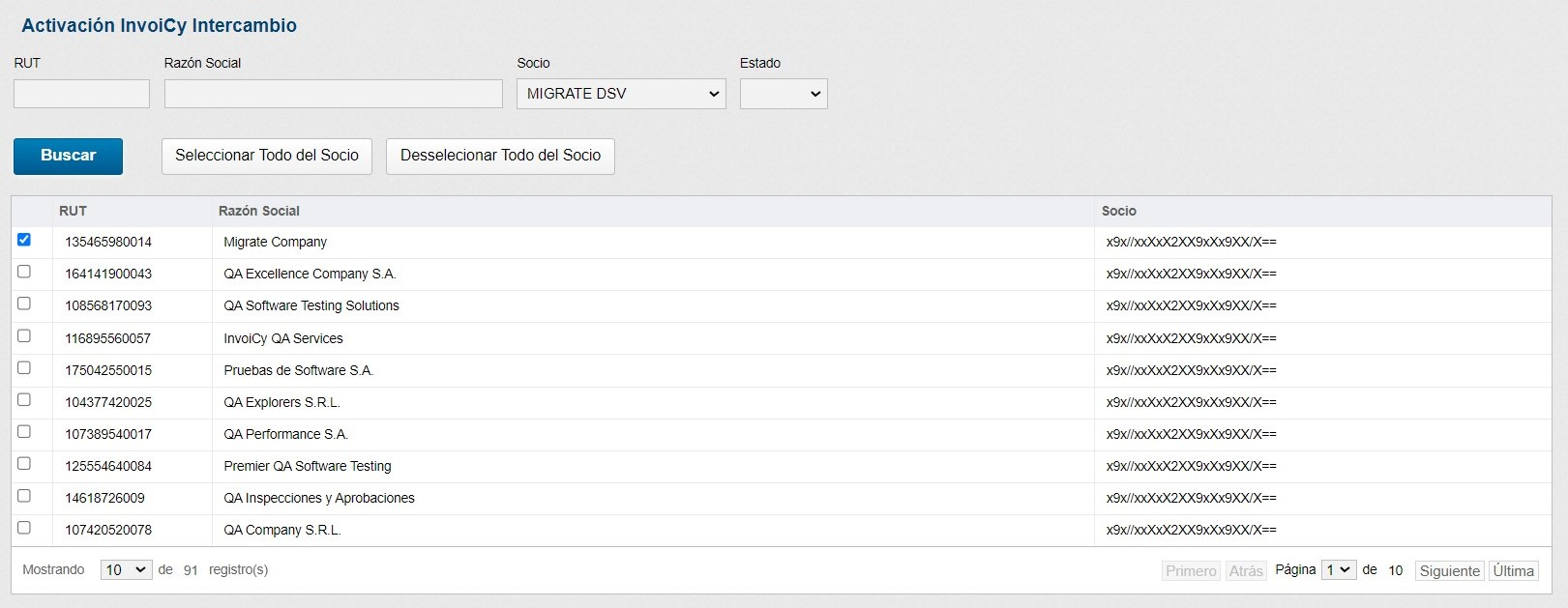 En caso de que existan empresas con diferentes claves de socios registradas en la instalación InHouse, solo estarán disponibles para activación las empresas con la clave del socio que haya contratado la extensión "InvoiCy Intercambio".