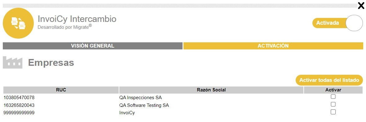 En la pestaña "Activación", se mostrarán las empresas a las que el usuario tiene acceso, pudiendo activar o desactivar el uso de la extensión. También será posible activar la extensión para todas las empresas ya registradas seleccionando la opción "Activar todas del listado".