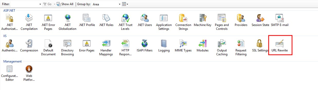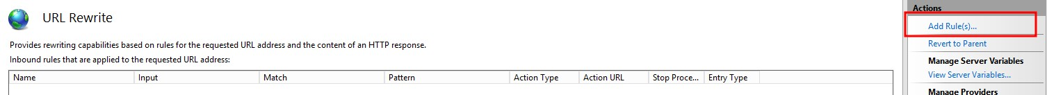 - En el administrador del IIS, haga doble clic en la opción "URL Rewrite" como se muestra en la siguiente imagen.