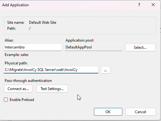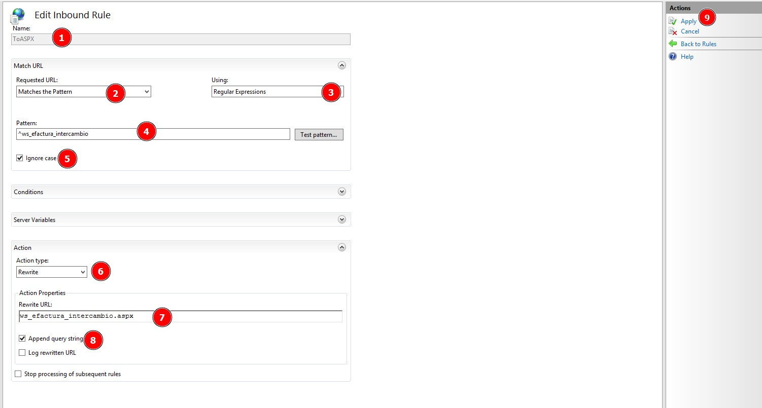 Después de crear el pool específico para el servicio de intercambio, será necesario configurar una redirección en el IIS, dado que el endpoint actual es “ws_efactura_intercambio.aspx” y la DGI acepta únicamente “ws_efactura_intercambio”.