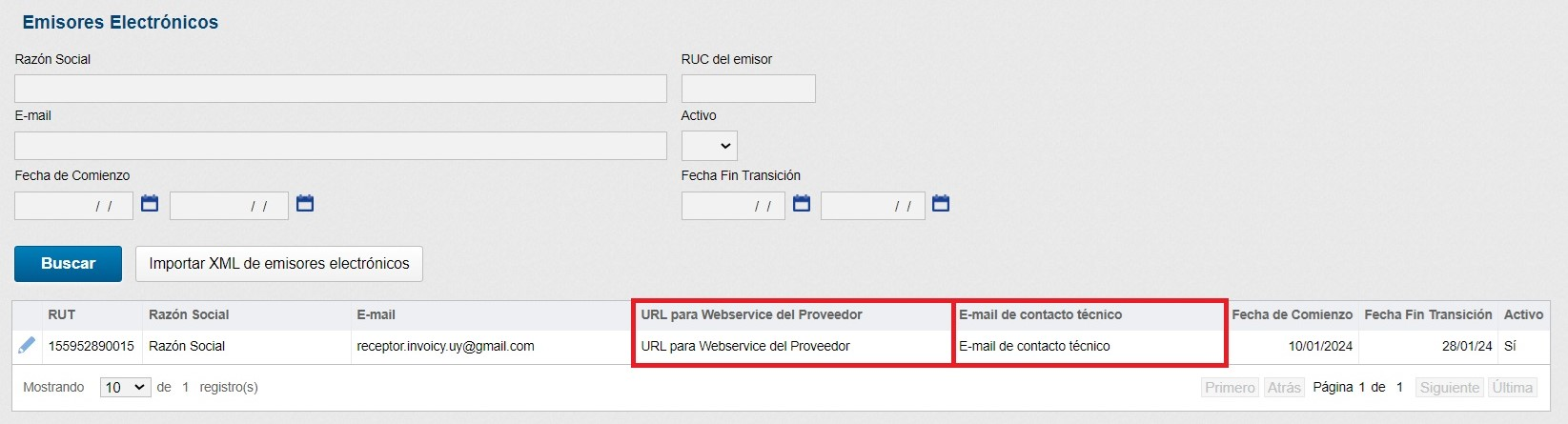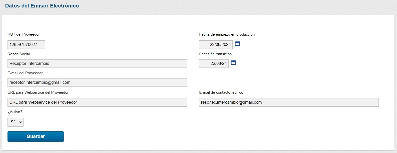 La URL del proveedor de cada emisor electrónico ingresada en esta pantalla se usará para enviar archivos y establecer comunicación entre empresas.