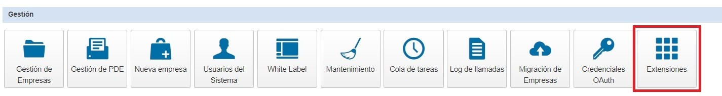 Una vez configurada la URL para el servicio de intercambio, se podrá activar la extensión para las empresas a las que el usuario tenga acceso mediante la opción "Extensiones". Esta opción se encuentra en el Panel de Control de InvoiCy, en el menú Gestión, y está disponible para instalaciones InHouse y para usuario ADMINISTRADOR.