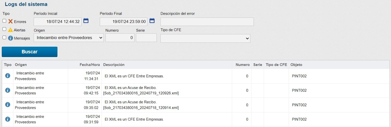 En la pantalla de “Logs del sistema” se almacenarán todas las acciones realizadas a través del servicio de intercambio. Se ha creado un nuevo tipo de origen denominado “Intercambio entre Proveedores” para registrar todos los tipos de solicitudes realizadas.
